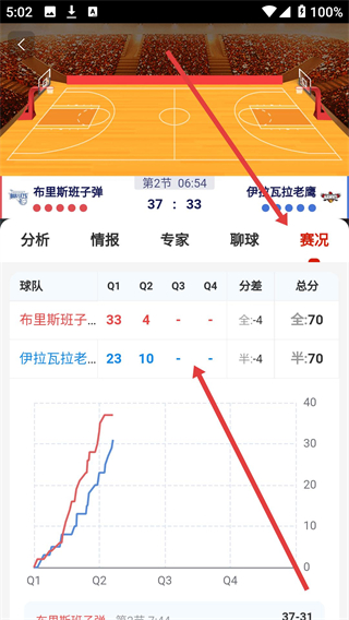 3、切换到赛况标签,可查看球队各节比分与数据走势图表,直观了解赛事进程与两队表现差异。