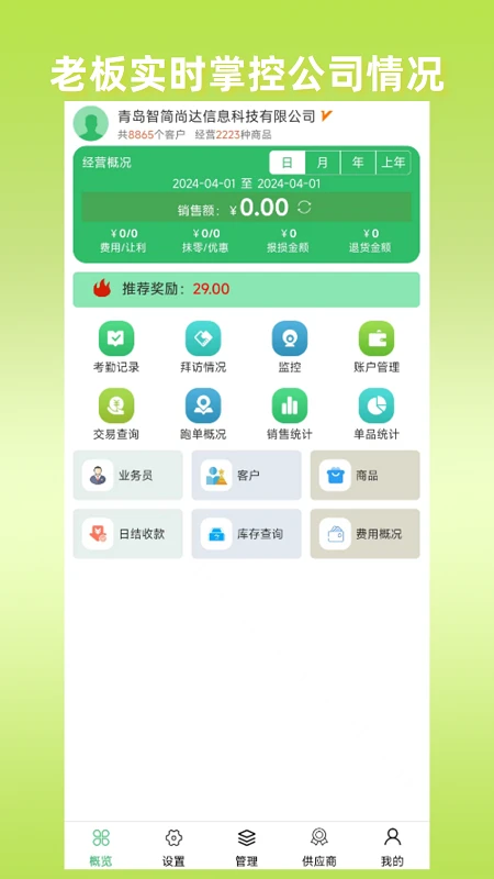 1、首先进入系统概览界面,这里可以查看经营状况的各项数据,点击底部设置选项,即可进入设置页面进行各类业务参数的调整。