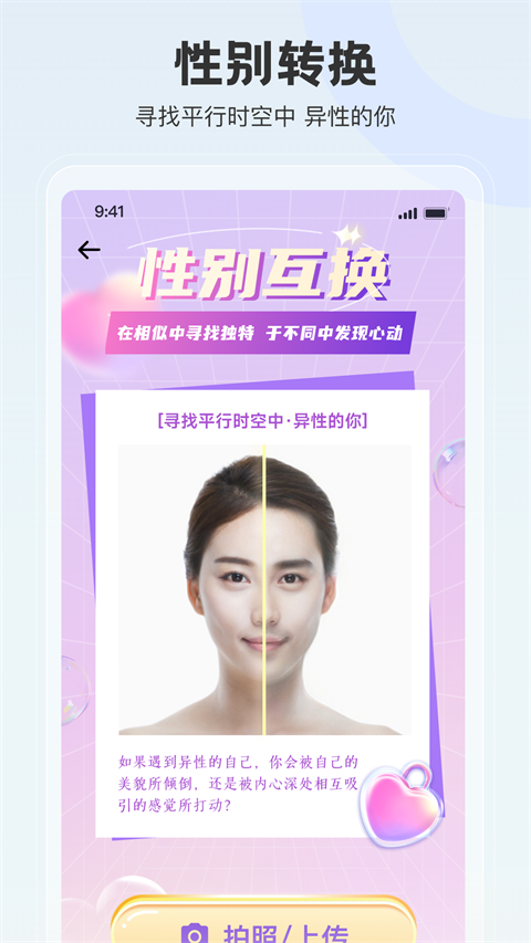 4、支持男女性别互换特效,用户上传照片后可一键生成自己转换为异性后的形象,满足猎奇与娱乐性的社交分享需求。
