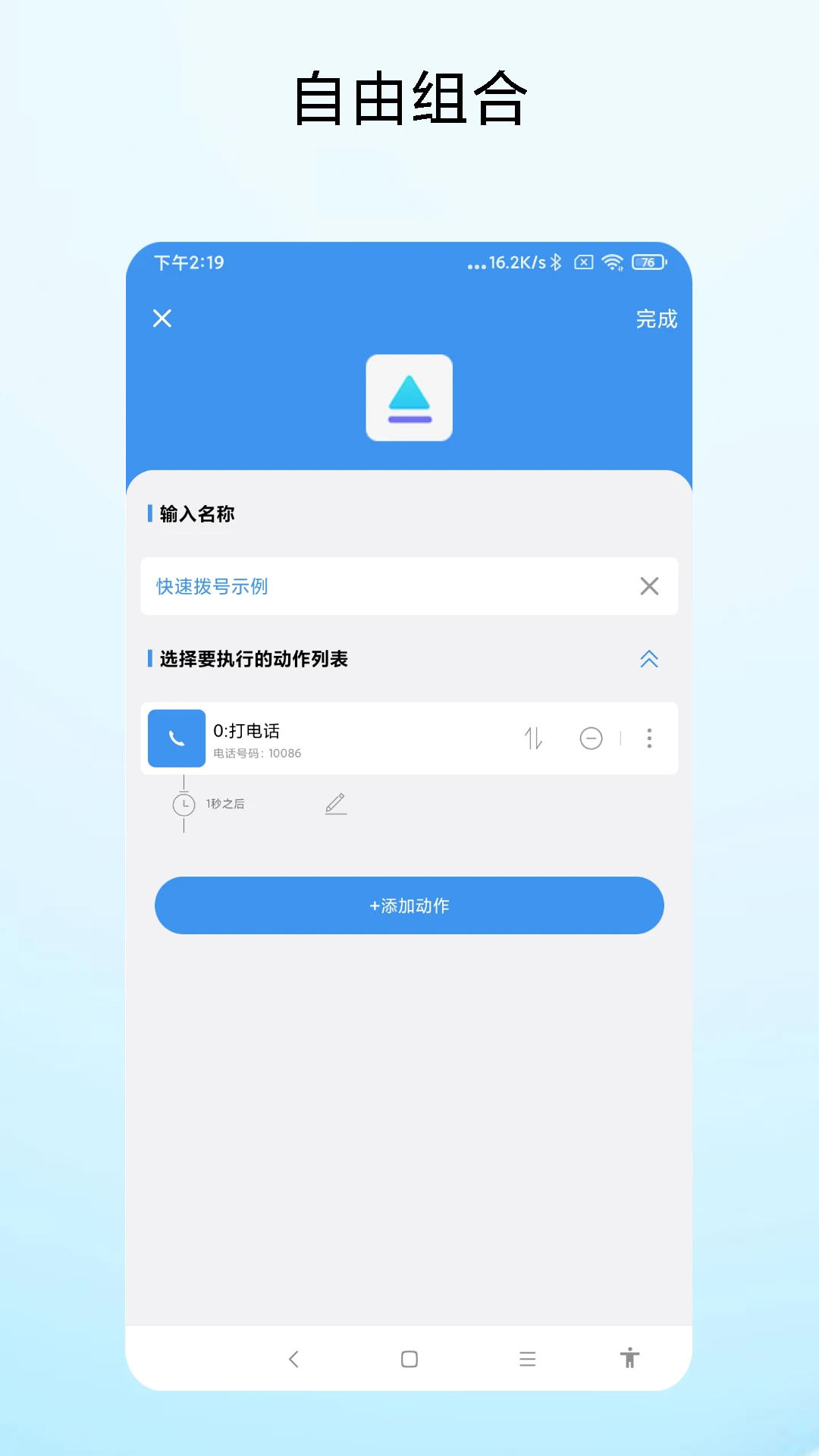 3、进入指令编辑页面,先输入指令名称,再从动作列表中选择已有的执行动作,点击添加动作可新增操作步骤。