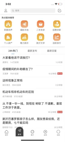 4、热点版块推荐页包含民意民声、摄影天地等功能入口,展示24小时内的热门内容,用户点击发布按钮即可创建内容并分享至平台。