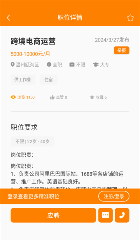 4、进入职位详情页可查看薪资结构、任职要求等关键信息,点击应聘按钮可一键投递简历,同时支持在线聊天或电话联系企业HR。