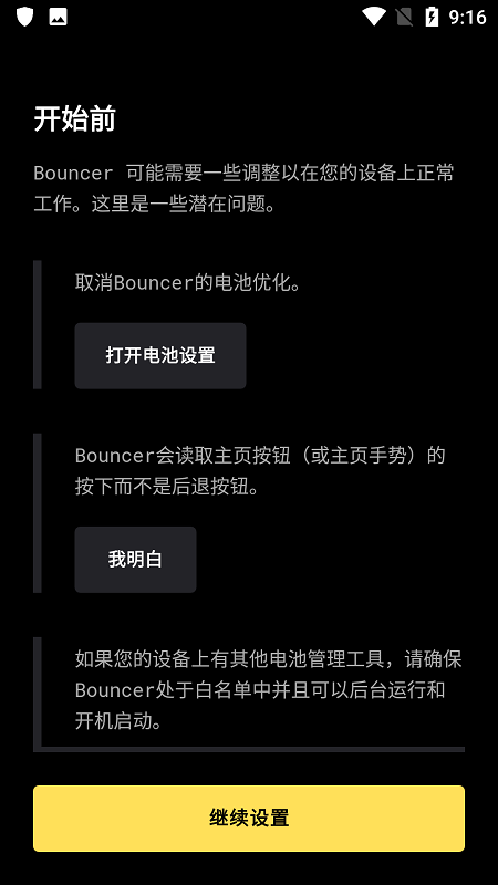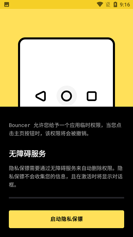 1、在Bouncer隐私守护助手的启动界面,通过无障碍服务自动清除应用临时权限,只需轻点启动,即可开启权限管理功能。