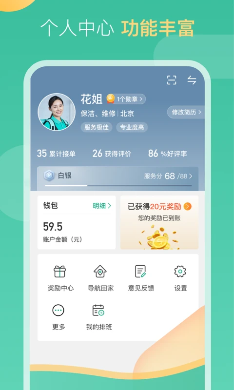1、资源丰富:58到家工作端应用依托58同城庞大的服务资源和用户基础,为服务人员提供了源源不断的工作机会。