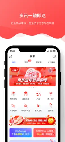 1、首先,进入京东云的探索页面,您可以通过产品和解决方案等入口轻松访问所需服务,并浏览精选的优质内容。
