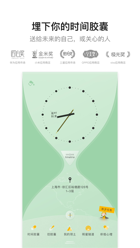 1、打开应用首页,用户可通过时间胶囊、挖胶囊等功能入口,轻松体验核心服务。顶部时钟与沙漏设计,直观展示时间进度。