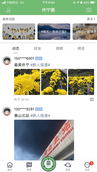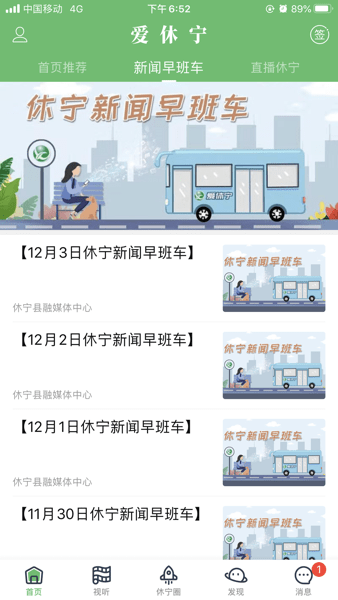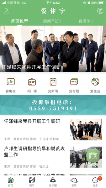 1、打开应用首页,利用搜索栏快速查找资讯,或切换至推荐、直播、休宁等标签,轻松获取本地政务、生活类信息。