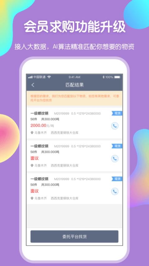 2、智能比价系统:用户可在APP内输入所需钢材的规格、数量等信息,系统将自动为用户筛选出最优惠的报价,节省用户的比价时间。