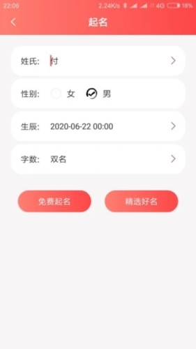 2、在起名页面,用户需要依次填写姓氏、选择性别、录入生辰、选定名字字数,填完信息后点击免费起名即可获取推荐的名字列表。