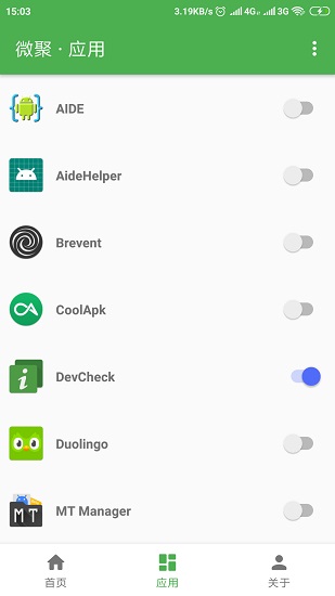 1、进入应用页面后可查看已安装应用列表,每个应用右侧设开关按钮顶部含搜索功能,底部导航栏切换首页应用等板块。