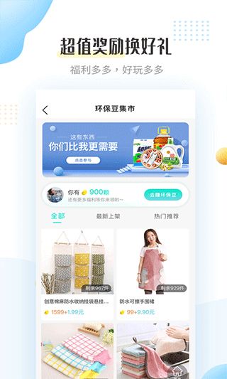 4、进入福利页面,用户可以查看自己的环保豆数量,并用其兑换心仪的商品。同时,还能参与签到获取积分,浏览各类商品并使用环保豆进行抵扣。