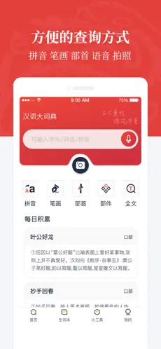 1、打开词典主界面,你可以通过顶部的搜索框直接输入字头或词目进行查询。此外,还可以选择拼音、笔画等多种检索方式,甚至参与每日积累板块,学习新词汇。