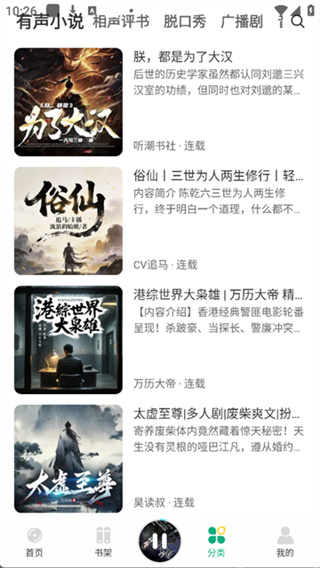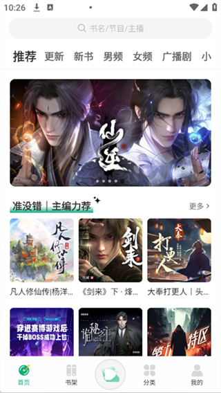 1 、在首页,用户可以通过顶部搜索栏快速查找想听的内容,也可以利用分类标签如推荐、更新、男频、女频、广播剧等轻松筛选作品。同时,主编力荐区会展示热门有声书,底部导航栏则可便捷切换至首页、书架、分类或个人空间。