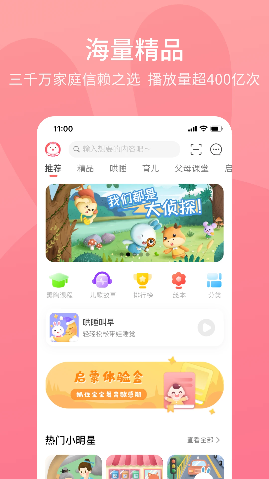 2、搜索框激活后,用户还可以从热门搜索中选择推荐内容,如睡前故事、英语启蒙等,直接进入相应分类的资源页面。