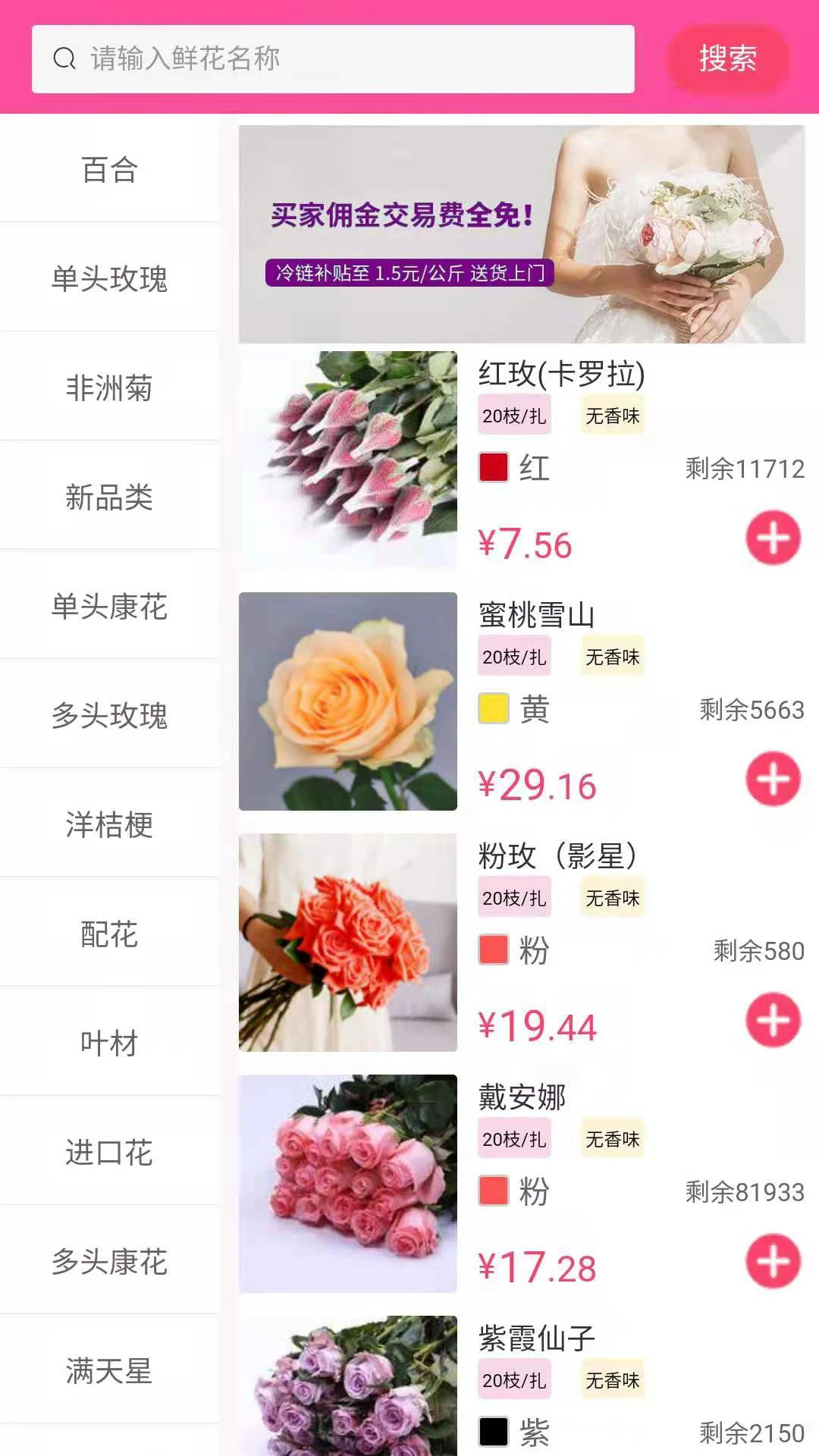 2、进入分类页面后,搜索您所需的花材,即可查看该花材的不同品类及对应价格,例如红玫瑰的多种款式,您可以根据个人需求选择心仪的品类。