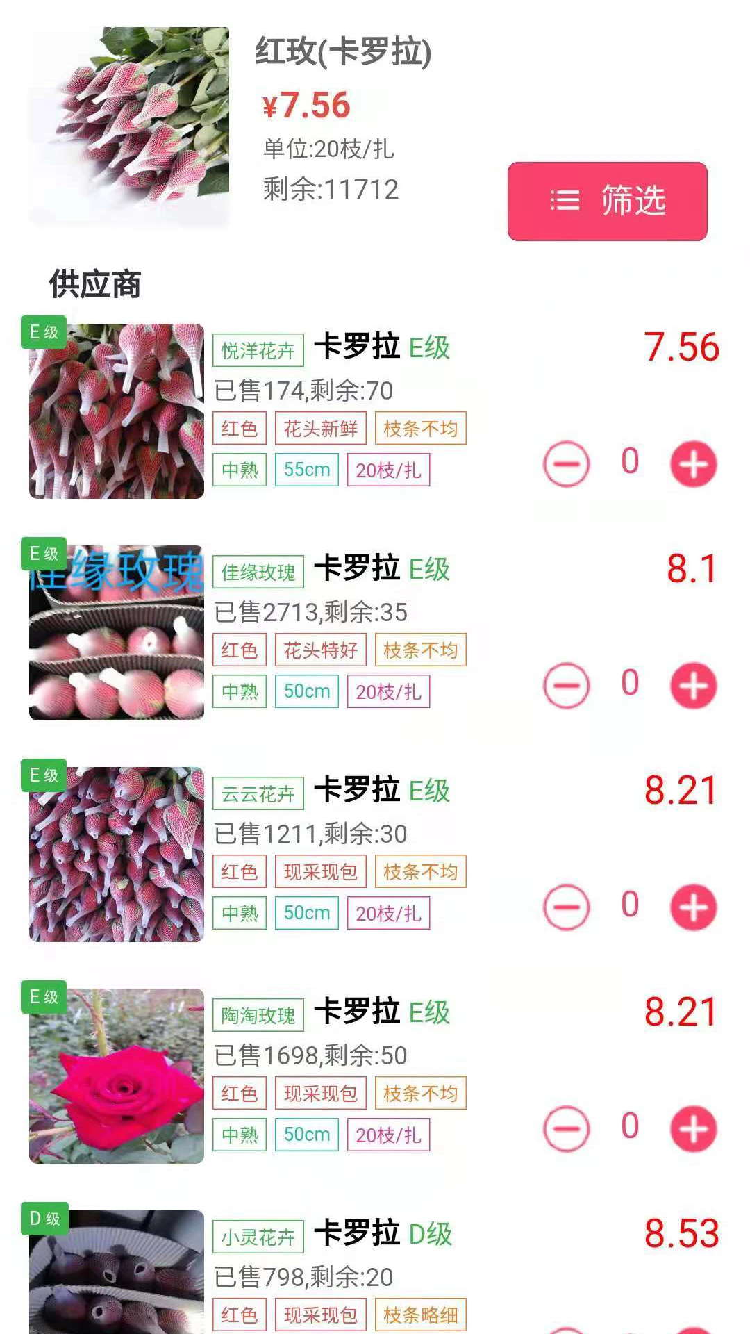 4、进入供货商列表页面,您可以查看对应花材的不同供货商报价及规格,通过加减按钮轻松调整购买数量,最终按需选择合适的供货商进行下单。