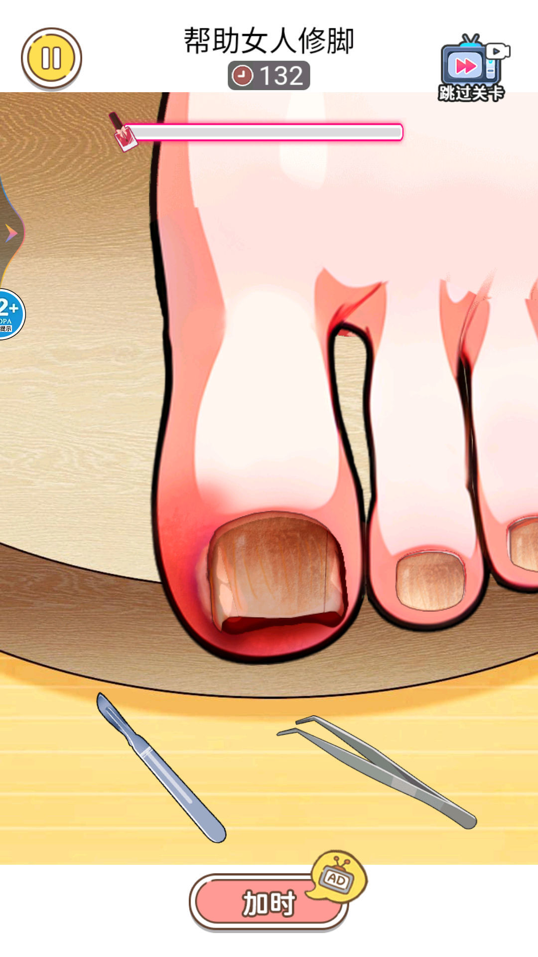 4、当所有修脚操作圆满完成后,耐心等待通关提示的出现,点击下一关按钮,即可轻松进入新的关卡,继续投身于后续的操作任务中。