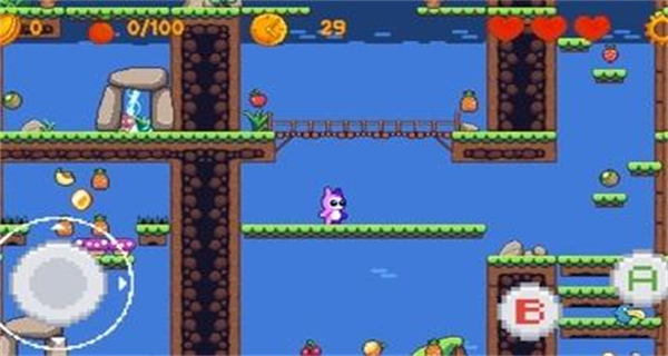 2、进入关卡后,利用操控界面的移动控件控制角色在不同平台间灵活穿梭,同时收集场景中的水果类物品,以推进关卡进度。