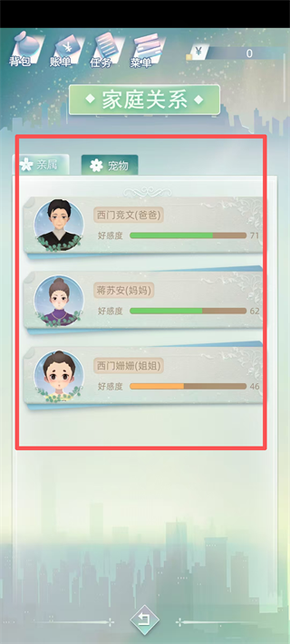 2、在家庭关系界面中,仔细查看各亲属的好感度数值,明确当前与家人的亲密度状况,以便有针对性地进行好感度提升操作。