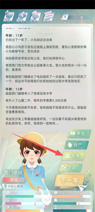 1、首先,点击关系按钮,进入家庭关系界面,为后续提升与家人的好感度做好准备,推动游戏内的社交互动进程。