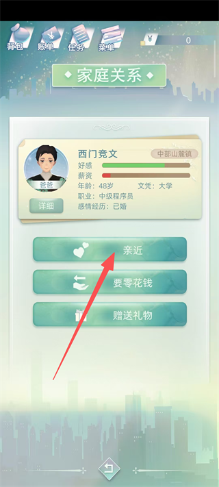 3、选择想要提升好感度的目标亲属,点击亲近按钮,触发与该亲属的互动事件,通过互动来增加彼此之间的好感度数值。