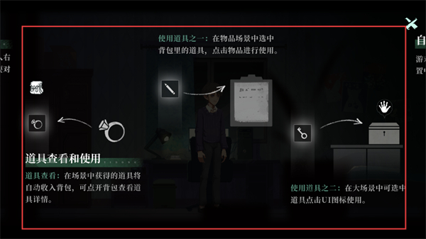 3、玩家获取道具后,道具会自动存入背包。玩家可以随时打开背包查看道具详情,并在物品场景中选中背包中的道具进行使用,或者在大场景中选中道具后点击UI图标进行使用。
