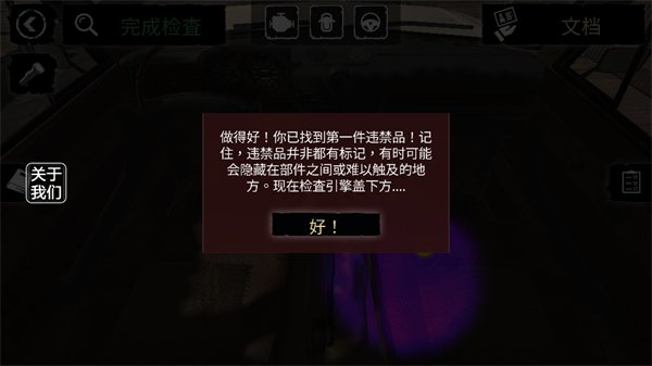 2、仔细查看违禁品藏匿处的提示信息,了解货物油箱等可能藏匿违禁品的位置,点击“好”确认提示,以便后续精准查找违禁品。