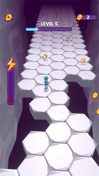 1、在关卡中,玩家需操控角色沿着六边形路径移动,避开粉色破损陷阱区域,同时收集沿途金币,保持稳定的前进节奏,避免失误。