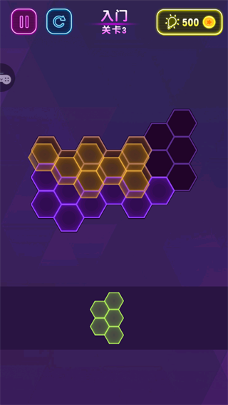 2、进入新手关卡,屏幕上方是六边形空位区域,下方会随机出现不同形状的六边形方块,等待玩家进行放置操作。