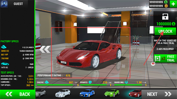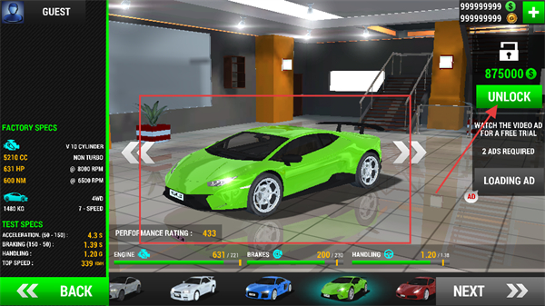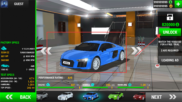 2、在车库中找到目标蓝色车辆,仔细确认其属性信息后,消耗相应的金币,点击UNLOCK按钮解锁该车辆。