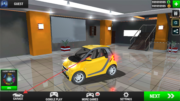 1、在游戏主界面,点击GARAGE选项,即可进入车库界面,由此开启更换车辆的操作流程。