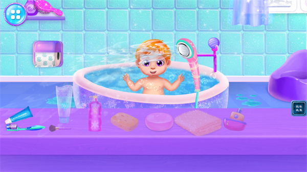 2、步入浴室场景,利用浴盆旁的洗浴用品,为宝宝清洁身体,完成洗澡环节,让宝宝保持清爽舒适。