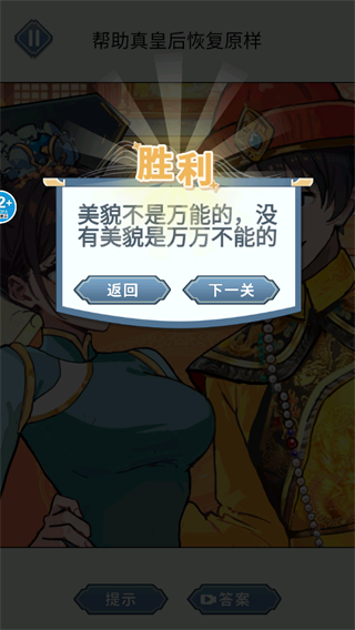 4、根据剧情推进完成指定操作,妥善处置伪装者角色,最终助力真皇后完美恢复原貌,达成关卡通关核心条件。