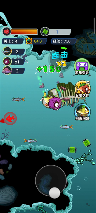 2、持续吞噬更多鱼类提升连击数,同时获得对应的数值加成,增强咸鱼的吞噬能力,更高效地完成关卡任务。