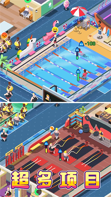 2、持续解锁趣味运动设备与服务项目,游戏进程中逐步开放拳击沙袋、攀岩墙、动感单车等特色项目。