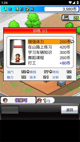 车手训练项目:游戏初期有4种训练项目,通过赞助商奖励可解锁另外8种。当某种训练无法提升属性时,不妨尝试其他训练项目,因为每种训练都有其属性上限。