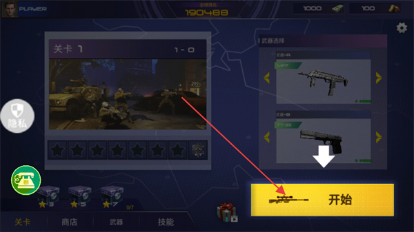1、在关卡选择界面挑选心仪的武器,确认配置后点击开始按钮,即可进入对应场景开启激烈对战。