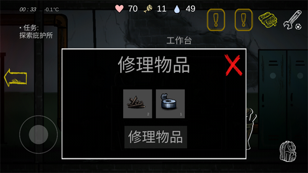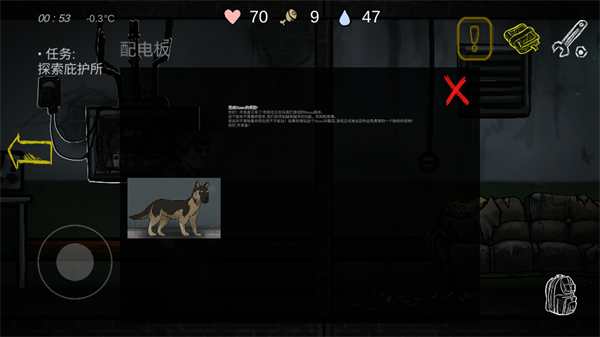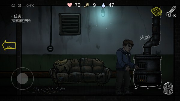 1、在庇护所场景中操控角色移动,靠近场景内标注的互动区域,触发交互机制获取关键道具,推动探索进度。