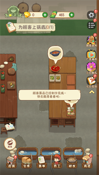 1、按照流程依次完成点单、上菜、上锅、结账、打扫等操作,注意不洗碗会影响出菜速度,需按步骤稳步推进店铺经营流程。