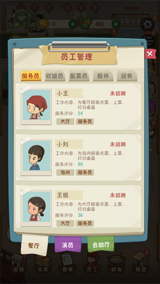 罗阿姨:负责洗碗,一定要聘请她,因为没人洗碗就无法支撑餐厅运营,更别说挂机获收益了;