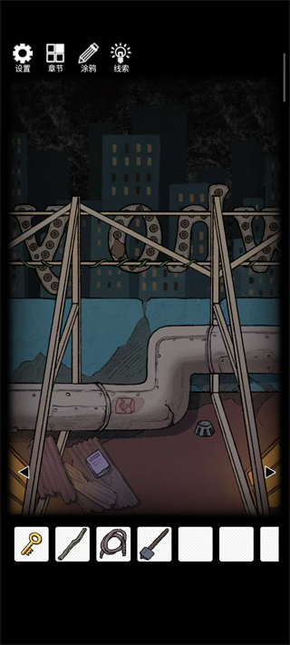 1、首先关注场景中的线索提示,发现灯牌架旁松动的钢条后,使用对应工具将其捶断以获取关键道具,为后续解谜环节积累必要物品。