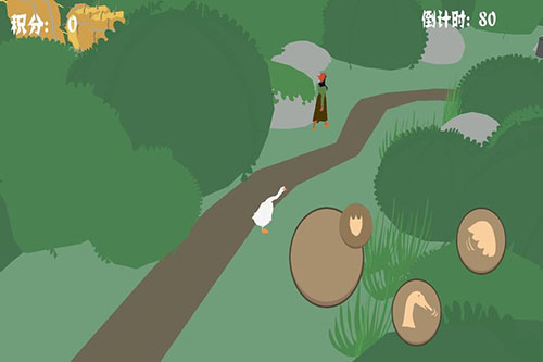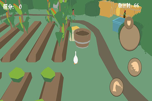 3、操作方面,左侧虚拟摇杆控制大鹅移动,双击可实现短距离奔跑;右侧按键分别对应鸣叫、叼取物品与扇动翅膀三个核心动作,简单易上手。