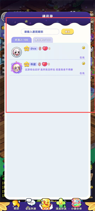 4、进入通讯录界面,玩家既可通过搜索角色名称来查找目标,也能轻松查看已添加的好友列表,从而有效管理自己的好友关系。