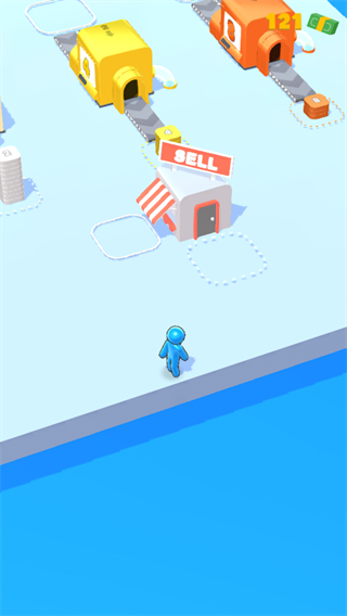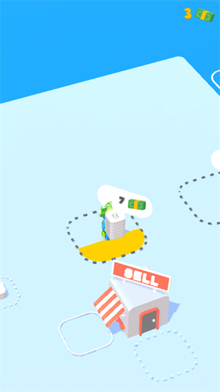 1、玩家需操控角色在场景中收集资源,例如堆叠的货币,积累建造设施所需的基础材料。