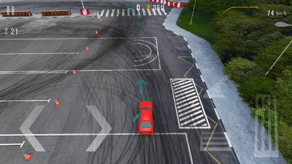 2、驾驶车辆沿赛道疾驰,时刻留意右上角【45km/h】的速度显示,平稳起步,谨防碰撞路障,确保行驶安全。