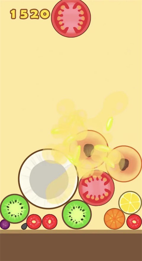 1、操控下落的【番茄】切片,精准瞄准下方同类型切片发射,让相同切片碰撞融合,从而获取分数。