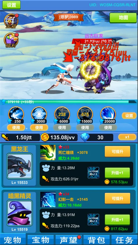 2、遭遇【黑龙王】BOSS时,只需轻点宠物【狂狼】的【升级+1】按钮,消耗金币即可迅速提升战力。