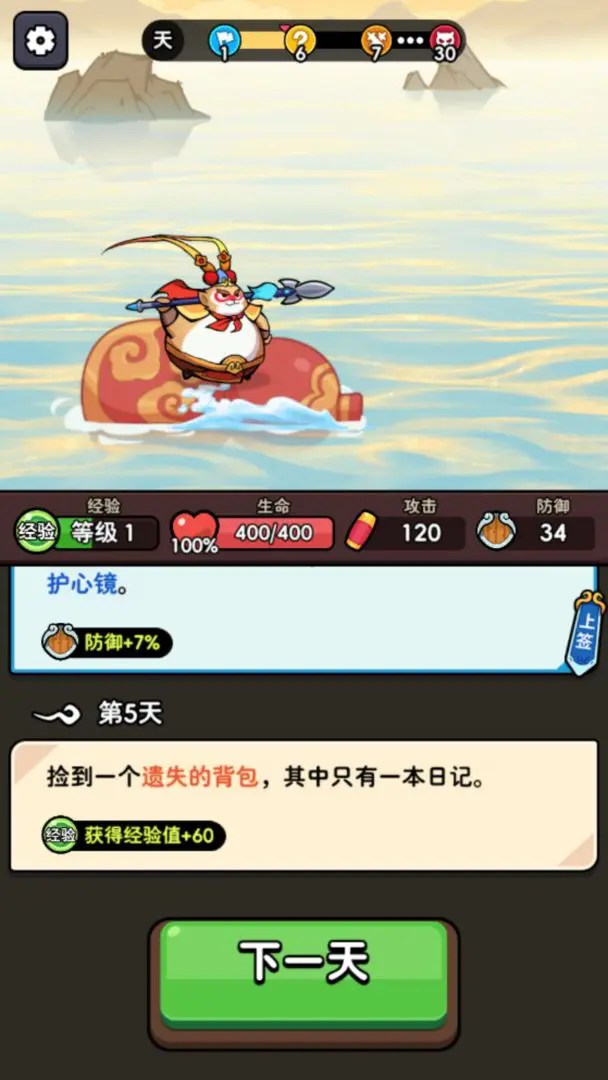 3、然后,查看获得的奖励与新学技能信息,确认无误后点击下一天按钮,即可推进剧情进入新的天数阶段。