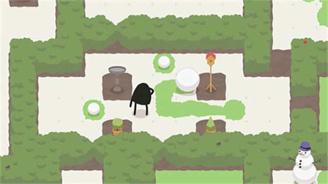 1、游戏玩法和推箱子类似,玩家要控制黑色小人,遵循头小身大的原则,将关卡中三个不同大小的雪球堆成一个雪人。